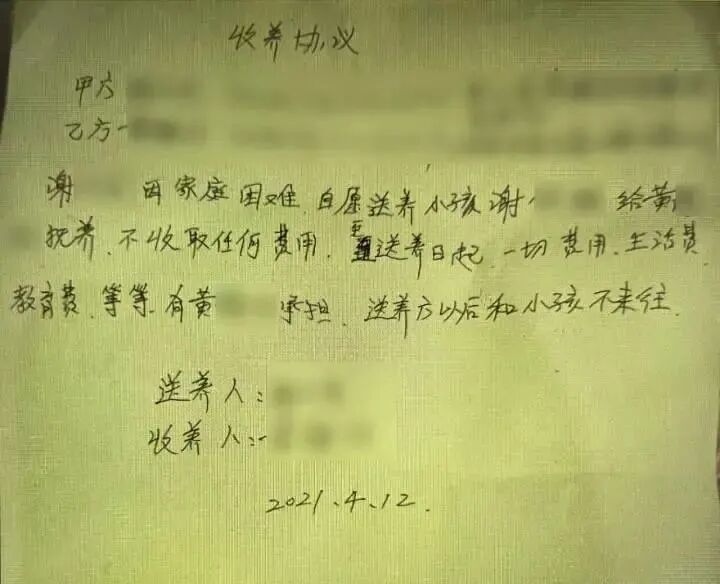 簽訂(dìng)送養協議的時候,這個(gè)父親更是沒有絲毫留戀,仿佛甩掉一個(gè)包袱般輕快灑脫:“送養方和孩子不能有任何來往。”