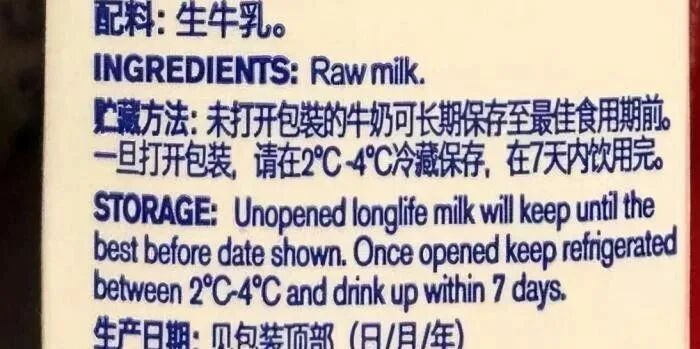 除瞭(le)日期之外就要看牛奶的配料情況,其實純(chún)牛奶的配料表很簡單,最主要的就是“生牛乳”,但是市面上很多的牛奶都會有水與各種的食品添加劑而組成,在購牛奶的時候,大家一定要看好牛奶的配料表及成分。